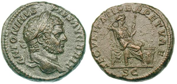 Caracalla AE As. 210-213 AD. ANTONINVS PIVS AVG, laureate head right / SECVRITATI PERPETVAE, Securitas seated right, holding hand to head & sceptre, altar to right. Cohen 577.
