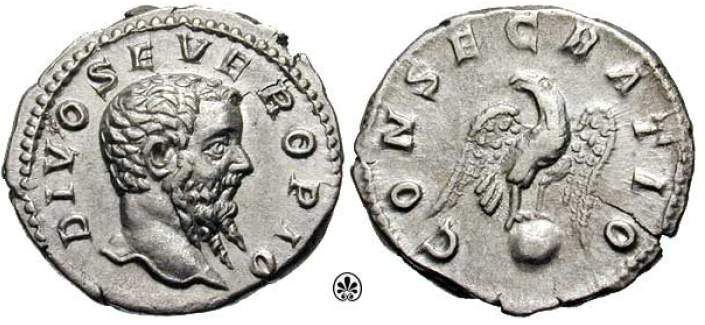 Divus Septimius Severus Denarius. 211 AD. DIVO SEVERO PIVO, bare head right / CONSECRATIO, eagle standing facing on globe, head left, wings spread. RSC 84.