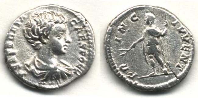 Geta, as Caesar, Denarius. 201 AD. P SEPT GETA CAES PONT, draped bust right / PRINC IVVENT, Geta standing left in military attire, holding branch & inverted spear. RSC 159a.