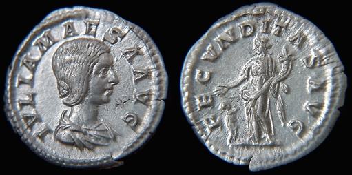 Julia Maesa Denarius. 218-220 AD. IVLIA MAESA AVG, draped bust right / FECVNDITAS AVG, Fecunditas standing left, extending her hand over a child & holding cornucopiae. RSC 8.