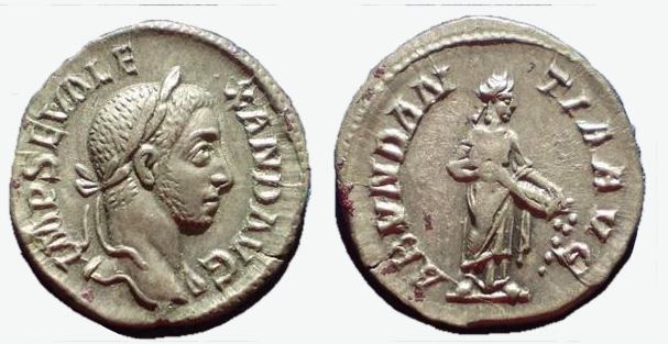 Severus Alexander Denarius. IMP SEV ALE XAND AVG, laureate head right / ABVNDANTIA AVG, Abundantia standing right, pouring coins from cornucopia. RSC 1.