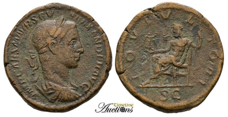 Severus Alexander AE Sestertius. Struck ca 225 AD. IMP CAES M AVR SEV ALEXANDER AVG, laureate, draped & cuirassed bust right / IOVI VLTORI, Jupiter seated left, holding Victory and sceptre, SC in ex. Cohen 98.