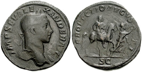Severus Alexander Æ Sestertius. IMP SEV ALEXANDER AVG, laureate head right, slight drapery on far shoulder / PROFECTIO AVGVSTI, emperor on horseback right, holding spear, preceded by Victory walking right, holding wreath & palm. Cohen 492.