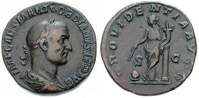 Ref Gordian I AE Sestertius, IMP CAES M ANT GORDIANVS AFR AVG, Laureate, draped and cuirassed bust right / PROVIDENTIA AVGG, Providentia standing left, leaning on column, legs crossed, holding wand and cornucopiae, globe at feet, S-C across fields. RIC 9; BMC 5; Cohen 6; Sear 8450.