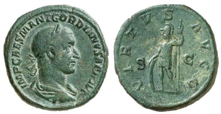 Gordian I AE Sestertius. IMP CAES M ANT GORDIANVS AFR AVG Laureate, draped and cuirassed bust right / VIRTVS AVGG, S-C across fields, Virtus standing left, holding spear and resting right arm on shield. RIC 14, Cohen 15.