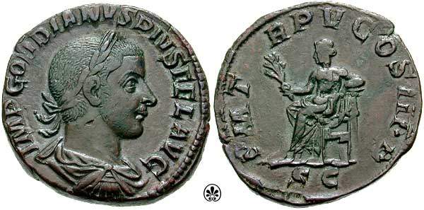 Gordian III Æ Sestertius. IMP GORDIANVS PIVS FEL AVG, laureate & draped bust right / P M TR P V COS II P P S-C, Apollo seated left holding branch & resting on lyre. RIC 303a, Cohen 262.