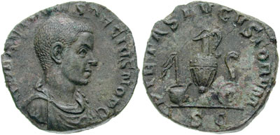 Herennius Etruscus, As Caesar, Æ Sestertius. Q HER ETR MES DECIVS NOB C, draped bust right, seen from behind / PIETAS AVGVSTORVM, S C in exergue, simpulum, aspergillum, ewer, & lituus perched on top of patera. RIC 168a, Cohen 15.