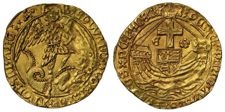 | Seaby 2144A | Edward V, AV angel (six shillings and eight pence). AD Feb-April 1483. , final issue of reign, 5.19g. EDWARDxx DIxx GRAxx REXxx AnGLxx Z FRAn' xx, St Michael slaying dragon right, mintmark boar's head. / PER CRVCE'. TVA. SALVA' nOS. XPC' REDEMPT', ship sailing right, quartered shield at centre, E and rose above with cross, initial mark halved sun and rose. Seaby 2144A; North 1626; Schneider 482; BMC 364.. | Text | Image |