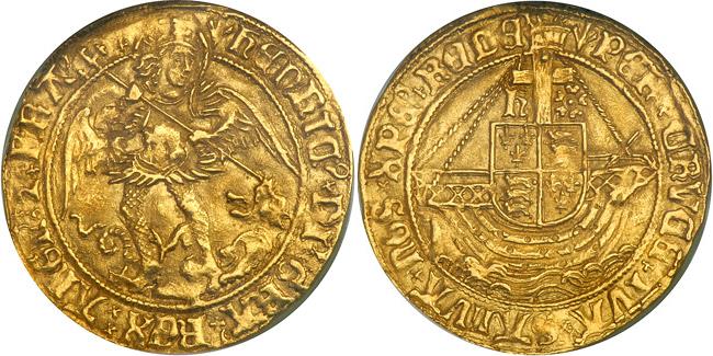 | Seaby 2187 | Henry VII, 1485-1509 AV Angel. HENRIC x DI x GRA x REX : ANGL : Z : FRANC, Archangel Michael slaying dragon / PER x CRVCE x TVA x SATVA x NOS x XPER x REDE, ship over waves, bearing shield, mast in form of cross above with h & rose to sides. Fr 151. | Text |  |