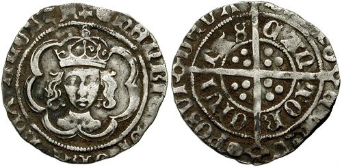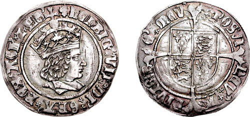 | Seaby 2258 | Henry VII AR Groat. Profile issue, 1505-1509. London mint. Mintmark cross-crosslet. (cross-crosslet) HENRIC' x VII x DI x GRA x REX x AGL x Z x F', crowned bust right / (cross-crosslet) POSVI DEV' : AVDITORE : MEV', long cross over arms. North 1747. | Text |  |