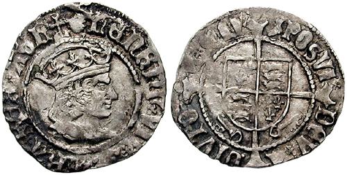 | Seaby 2261 | Henry VII (1485-1509) silver Half Groat. Martlet mm (struck 1504-09, mintmark used at both Canterbury & York mints). (martlet) HENIC x VII x DI x GRA x REX x ANGL x Z x, crowned, draped bust right / (martlet) POSVI DEV * DIVTOR ET MEV, shield quartered by long cross. | Text |  |