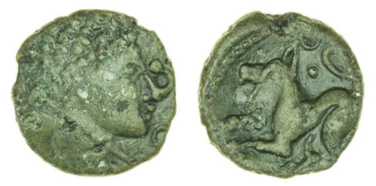 | BMC 660 | Celtic Britain, AE Potin, Cantiaci/Cantii tribe, Thurrock Type. Kent. 1st Century BC. 17.1 mm, 3.02 g. Laureate head of Apollo left. / Bull butting right. BMCCC 660-666; Van Arsdell 1402-42; ABC 43; SCBC 62. | Text | Image |