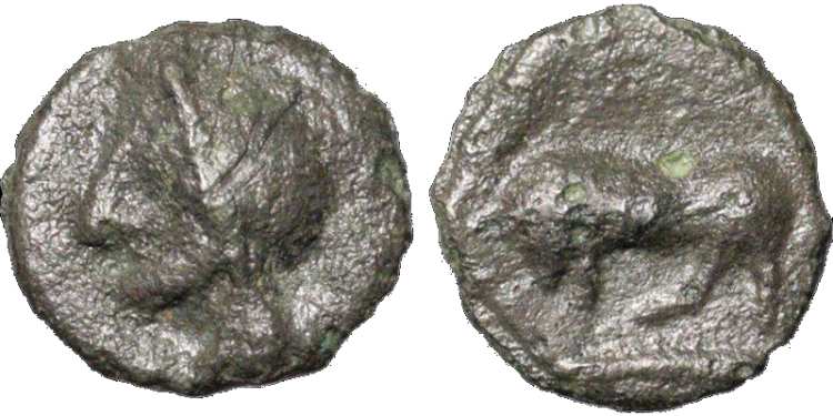 | VA 1404 | Cantiaci, Kent, Britain, AE cast potin unit, 2.10 gm. 15 mm. Class I. Stylized head of Apollo left. / Realistic bull butting left. Van Arsdell 1404. | Text | Image |
