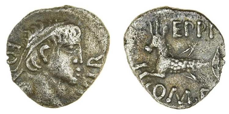 | VA 443 | Celtic Britain. Cantii, Eppillus and Verica, AR unit. ca. AD 10-20, 1.24 g. "Capricorn" type. CO VIR behind and before diademed, male head right. / EPPI COM F above and beneath capricorn left. VA 443; Seaby 117; ABC 435; Ashmolean CCI 88.0099 (this coin). | Text | Image |
