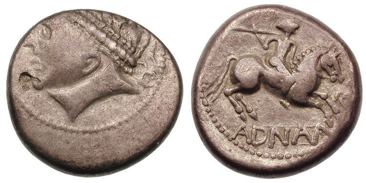 | Gobl 13 | Celtic Noricum AR Tetradrachm. Adnamati type. Beardless, laureate head left / Horseman galloping right, brandishing spear, ADMAN-ATI (AT ligate) in exergue & before horse.