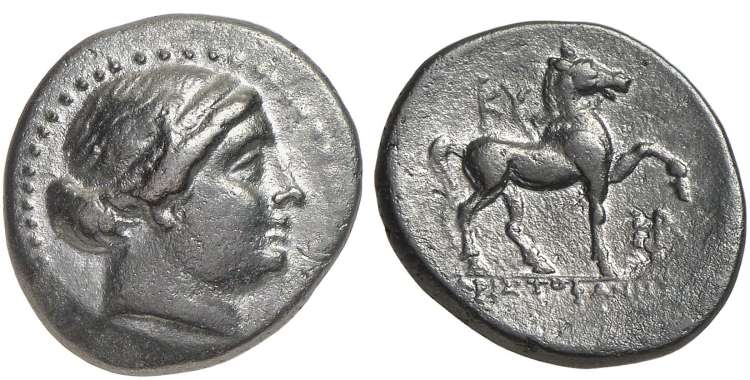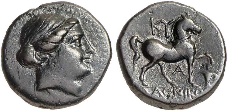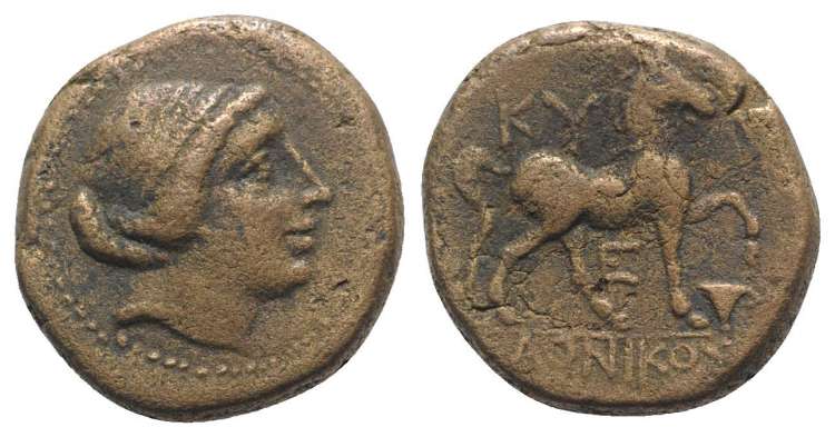 | BMC 62 | Aeolis, Kyme, AE20, civic issue, 250-190 BC. Magistrate Laonikos. 7.82 g. Head of the Amazon Kyme right, hair in a bun behind head. / KY above, ΛAONIKOΣ below, free horse standing right, left foreleg raised over one-handled cup, A beneath horse. BMC 62; SNG Stockholm 2207. | Text |  |
