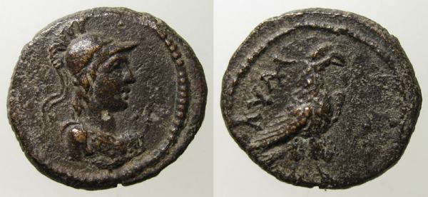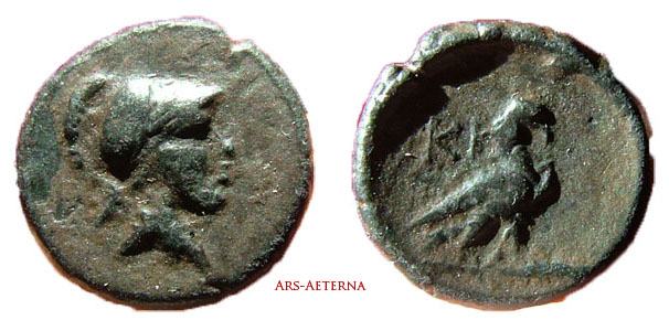 | Lindgren 400 | Kyme, Aeolis, AE12, 1.8 g, pseudo-autonomous issue, 117-192 AD. helmeted bust of Athena right / KY, eagle standing right, wings half-closed. Lindgren I 400; SNG Cop 121; BMC 103 var. (legend). | Text |  |
