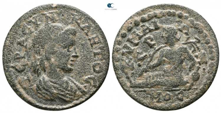 | BMC 114 | Kyme, Aeolis, AE22. Semi-autonomous issue. AD 253-268. IEΡA CYNKΛHTOC, bare-headed, draped bust of the Senate right / AIΛ EΡME KYMA-I XANΘOC around and beneath the river-god Xanthos reclining left, holding branch or reed, and resting left elbow on an overturned urn. BMC 114; SNG von Aulock 1648; Franke KZR 204; Prowe III 724; SNG Lewis II 1419. | Text |  |