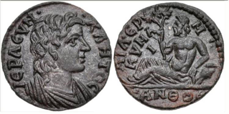| BMC 113 | Kyme, Aeolis, AE24, semi-autonomous issue. AD 253-268. IEΡA CYNKΛHTOC, bare-headed, draped bust of Senate right. / KYMAIΩN ΞANΘOC, river-god Xanthos reclining left, holding branch and resting arm on urn from which water flows. BMC 113; Weber 5519; Mionnet Supp VI,136; SNG von Aulock 1649; SNG Cop 127; SNG Lewis 1417-1418. | Text |  |