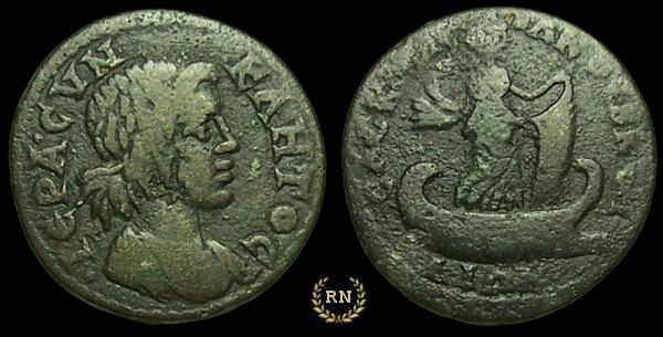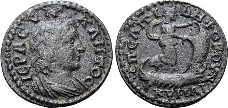 | BMC 116 | Kyme, Aeolis, AE24, semi-autonomous issue. AD 253-268. 5.43 g. Magistrate Elpidiphoros. IEΡA CYNKΛHTOC, bare-headed, draped bust of the Senate right. / EΠ EΛΠIΔHΦOΡOYN KYMAI, Isis Pharia standing right on galley, holding billowing sail with both hands. BMC 116; SNG von Aulock 1647; Franke KZR 217; Mcclean 7918-7919; SNG Tuebingen 2706-2707; Walcher 2017. | Text |  |