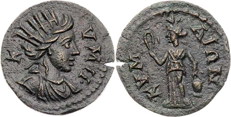 | Leu 4, 433 | Julia Domna, AE28 of Kyme, Aeolis. AD 193-217. 13.24 g. IOY ΔOMNA CEBACTH, draped bust right. / KYMAIΩN, Amazon walking left, holding short spear in her right hand and with serpent coiled around her left arm, small figure of a subdued Atlantian at foot left. Apparently unpublished. Leu 4, 433. | Text |  |