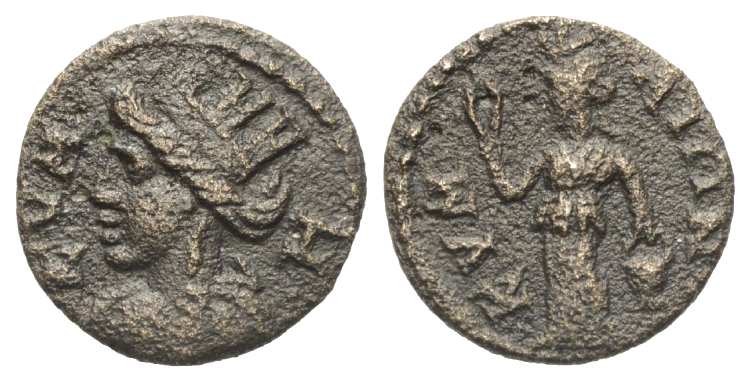 | BMC 118 | Kyme, Aeolis. AE16, 3.09 gr. semi-autonomous issue, AD 253-268. KYMH, Turreted and draped bust of the Amazon of Kyme ("Tyche") right / KYMAIΩN, Tyche standing left, kalathos on head, holding rudder and cornucopiae. BMC 118; SNG von Aulock 1650; Luynes 2527. | Text |  |