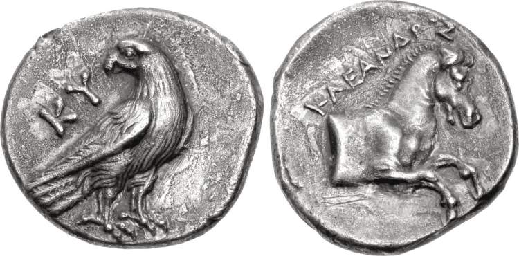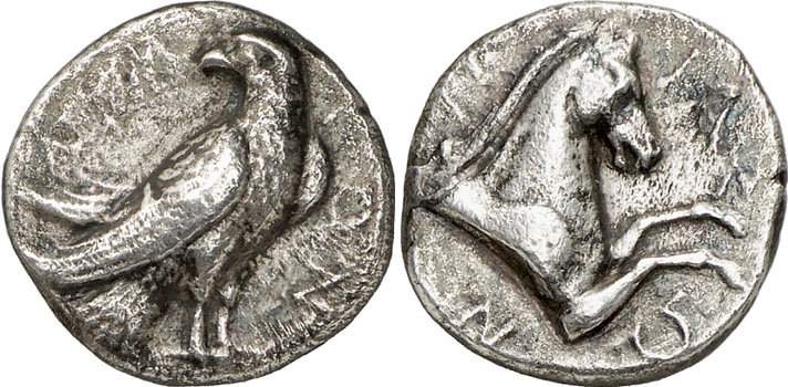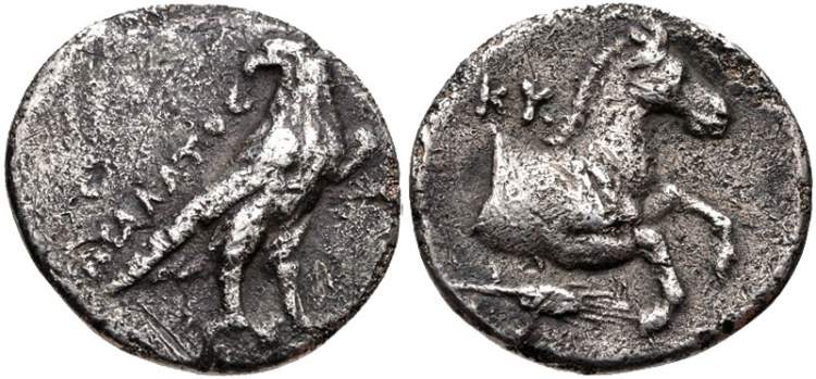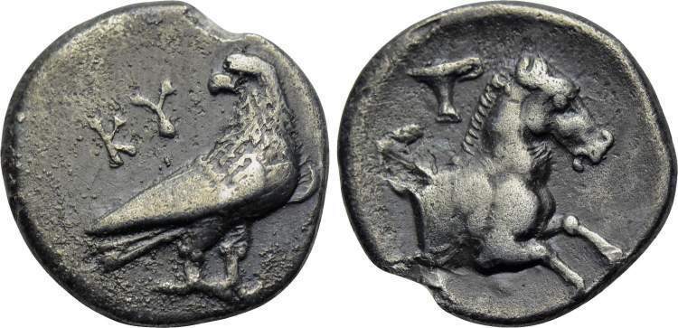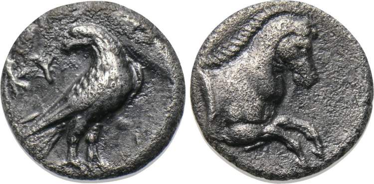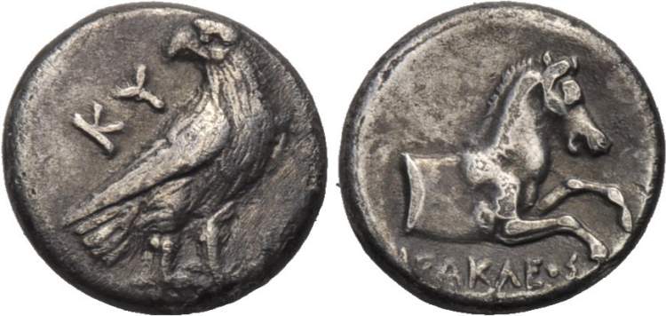 | Imhoof 5 | Kyme, Aeolis, AR hemidrachm, Ca 350-250 BC. 14mm, 1.96 g. Magistrate Kleandros. KY, eagle standing right, head turned back / KΛEANΔΡOΣ above forepart of horse running right. Imhoof 5 in "Zur Münzkunde des Pontus, von Paphlagonien, Tenedos, Aiolis..". | Text |  |