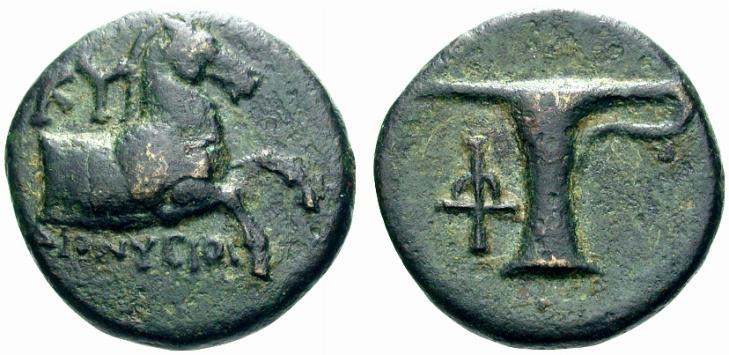 | BMC 42 | Kyme, Aeolis. AE17. 320-250 BC. Magistrate Dionysios. KY to left, ΔIONYCIOC beneath forepart of horse right. / IΩT monogram to left of a one-handled cup. BMC 42; Weber 5490; SNG Munich 463. | Text |  |