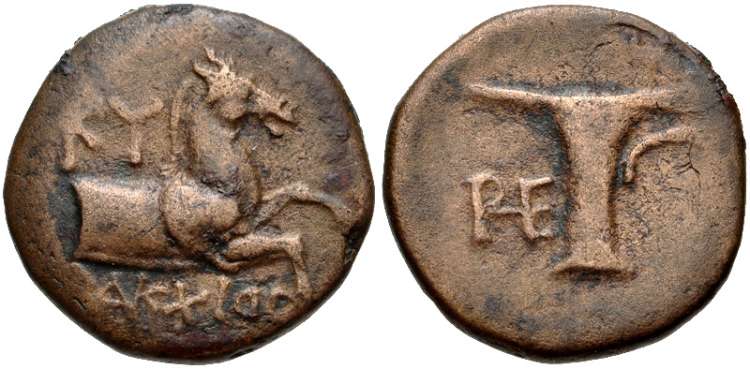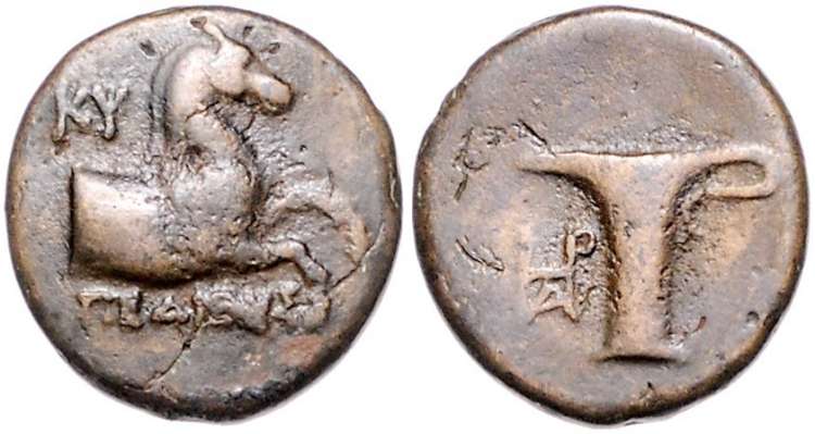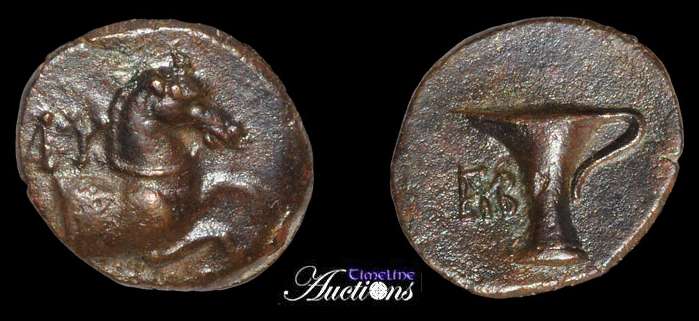 | Unal 30 | Kyme, Aeolis, AE17, ca 300-250 BC. Magistrate Parmeniskos. 5.4 g. KY ΠAΡMENICKOC, forepart of horse right / One-handled cup, ΣT monogram in left field. Unal 30 ("Kyme Excavations 1951-1954"); SNG Cop 81. | Text |  |