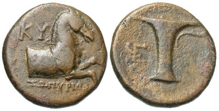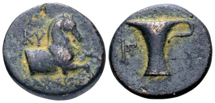 | Unal 35 | Kyme, Aeolis, AE17, ca 350-250 BC. Magistrate Zopirion. 4.24 g. KY ZΩΠYΡIΩN above and beneath forepart of horse right / One-handled cup, NΠA monogram in left field. Unal 35 (Kyme Excav. 1951-1954), legend completed). SNG Cop 79 var (monogram); SNG Munich 469 var (ditto). | Text |  |