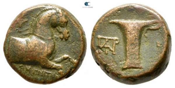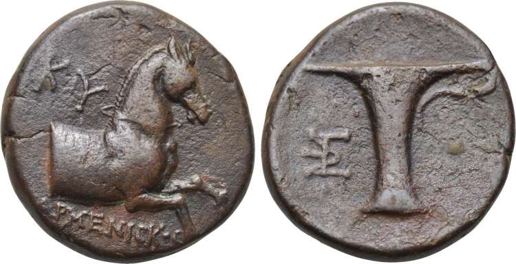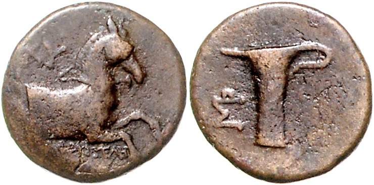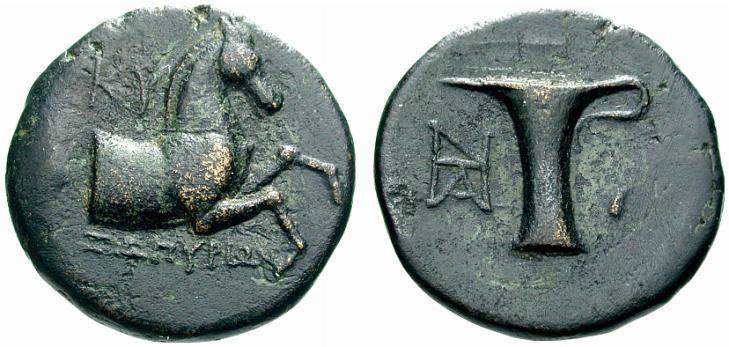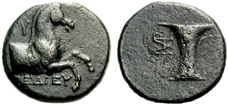 | BMC 49 | Kyme, Aeolis, AE15 civic issue, 350-250 BC. Magistrate Parmenites. 4.33 g. KY ΠAΡMENITHΣ to left and beneath forepart of horse right. / ΠΛTΡ monogram to left of one-handled cup. BMC 49 ("ΠAΡMENITOΣ" in error); SNG Cop 83; Mionnet Supp VI, 26. | Text |  |