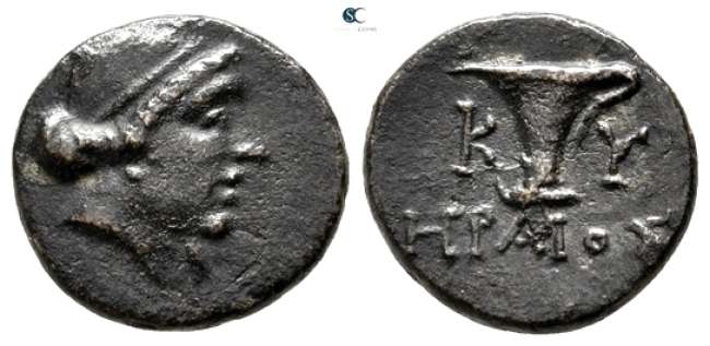 | BMC 53 | Kyme, Aeolis, AE12. 1.16 g. Magistrate Heraios. 250-190 BC. Head of the Amazon Kyme right. / K-Y HΡAIOΣ to left, right and beneath one-handled cup. BMC 53; de Luynes 2526; Lindgren I 393; SNG von Aulock 7695. | Text |  |