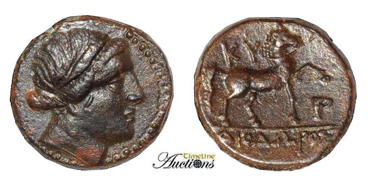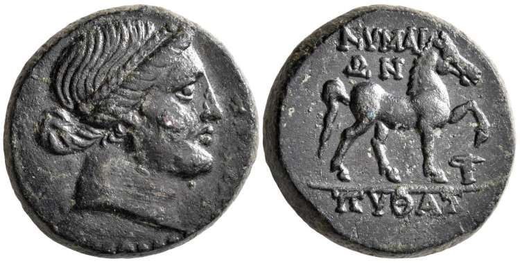 | BMC 66-69 | Aeolis, Kyme, AE20, civic issue, 250-190 BC. Magistrate Pythas. 9.06 g. Head of the Amazon Kyme right, hair in a bun behind head. / KYMAIΩN above, ΠYΘAΣ below, free horse standing right, left foreleg raised over one-handled cup. BMC 66-69; Weber 5499; Mionnet Supp VI, 105; Hunter 10; SNG Tuebingen 2699; SNG Cop 102; SNG von Aulock 7696; Lindgren I 396; SNG Lewis 872-873. | Text |  |