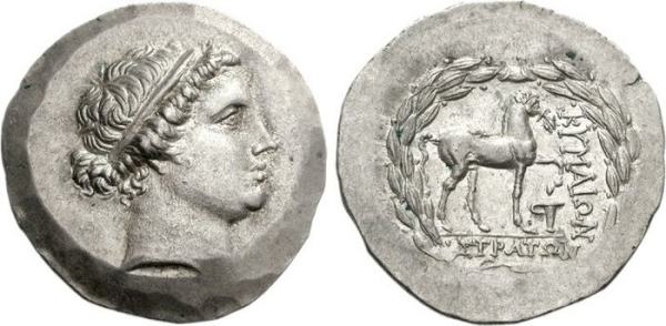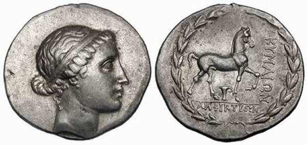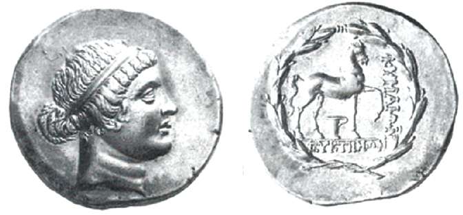 | Oakley 57 | Kyme, Aeolis. AR Tetradrachm. After 165 BC. Magistrate Eukthemon. Head of the Amazon Kyme right, hair bound in a taenia / KYMAIΩN EYKΘHMΩN, Horse standing right, one handled cup below. | Text |  |