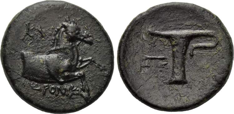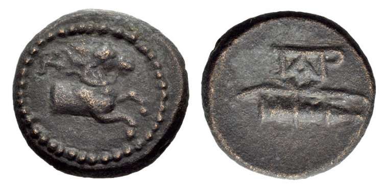 | G & N 15, 186 | Kyme, Aeolis. AE17. 320-250 BC. Magistrate Parmeniskos. 5.4 g. KY ΠAΡMENIΣKOΣ, forepart of horse right. / One-handled cup, TEΣ monogram to left. Unpublished monogram for this magistrate. Unal 30 var (ΣT monogram). Gitbud & Naumann 15, 186. | Text |  |