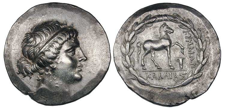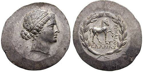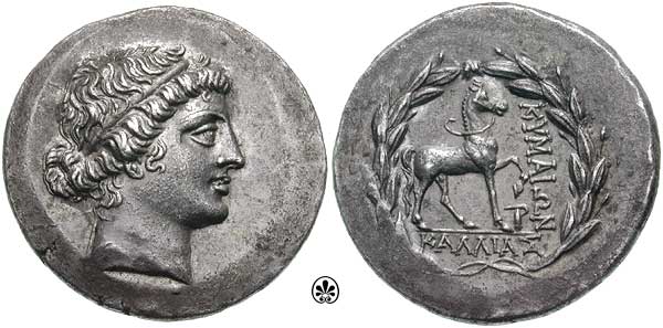 | Oakley 21 | Kyme, Aeolis AR Tetradrachm. Magistrate Kallias. After 165 BC. Head of the Amazon Kyme right, hair bound in a taenia / KYMAIΩN KAΛΛIAΣ, Horse standing right, one handled cup below. | Text |  |
