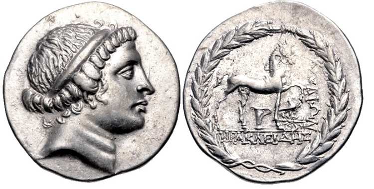 | Oakley 61 | Kyme, Aeolis AR Tetradrachm. ca 150-145 BC. Magistrate Seuthes. Head of the Amazon Kyme right, hair bound in a taenia / KYMAIΩN ΣEYΘHΣ, Horse walking right, left foreleg raised high, one-handled cup below. | Text |  |
