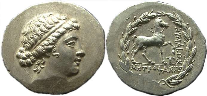 | Oakley 212a | Kyme, Aeolis. AR Tetradrachm. Second century BC. Magistrate Metrophanos. Head of the Amazon Kyme right, hair bound with ribbon / KYMAIΩN MHTΡOΦANHΣ, Horse prancing right, one handled vase at feet, all within laurel wreath. | Text |  |