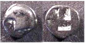 | BMC 12 | Kyme, Aeolis, AR hemiobol, 0.5 g. 480-450 BC. K-Y to left and below, eagle's head left. / Incuse square of mill-sail pattern. BMC 12; Luynes 2522; SNG Cop 32-33. | Text |  |