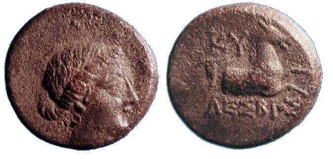 | SNG Cop 90 | Kyme, Aeolis. 250-190 BC. AE 13mm; 1.9g. Magistrate Lesbios. Head of Amazon right / KY - ΛEΣBIOΣ, Forepart of horse right, one-handled cup behind. SNG Cop 90; SNG Stockholm 2205; SNG Leipzig 1124; Unal 44. | Text |  |