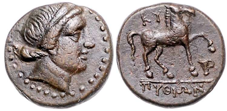 | SNG Cop 101 | Aeolis, Kyme, AE18, civic issue, 250-190 BC. Magistrate Pythios. 6.92 g. Head of the Amazon Kyme right, hair in a bun behind head. / KY above, ΠYΘIΩN below, free horse standing right, left foreleg raised over a one-handled cup. SNG Cop 101; BMC 71-72; Weber 5500; SNG Lewis 875. | Text |  |