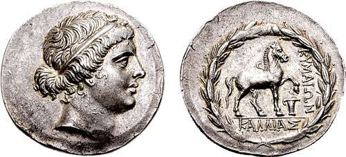 | Oakley 19 | Kyme, Aeolis AR Tetradrachm. ca 150 BC. Magistrate Kallias. Head of Amazon Cyme right, in hairband / KYMAIΩN KAΛΛIAΣ, horse walking right, left foreleg raised above one-handled cup, all in laurel wreath. | Text |  |
