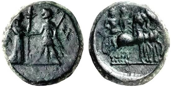 | SNG Cop 113 | Kyme, Aeolis. After ca 190 BC. AE 16mm. K-Y across fields, Artemis standing right, holding torch and clasping hands with figure standing left, holding transverse spear / Two figures in quadriga right; one holding long transverse spear. BMC 96. | Text |  |