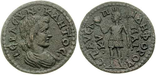 | BMC 163 | Salonina and Valerian II, AE20 of Kyme, Aeolis. AD 253-255. KOΡ OYAΛEΡIANOC K K CAΛΩNINA, bare-headed, draped bust of Valerian II right, facing diademed and draped bust of Salonina left / EΠ EΛΠIΔHΦOΡOY KYM-AI, Dionysos, loins draped, standing left, leaning on column, holding kantharos and thyrsos, panther at foot. BMC 163; Weber 5540; SNG Cop 163; Lindgren III A326A; Mionnet Supp. VI, 165; Bernhart 577. | Text |  |