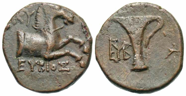 | BMC 45 | Kyme, Aeolis. 350-250 BC. AE19. Magistrate Eubios. 6.69 gr. KY, forepart of horse right, EYBIOΣ below / One-handled drinking cup, EYB monogram to left. SNG Cop. 76; BMC 45 corr. ("TEYB"). | Text |  |