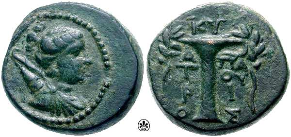 | SNG vA 1641 | Kyme, Aeolis. AE 17mm. 2nd-1st Century BC. Draped bust of Artemis right with bow and quiver / AΠATOYΡIOΣ, One-handled cup. | Text |  |