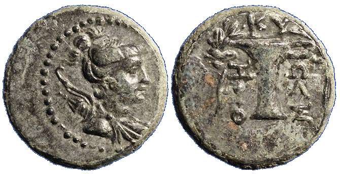 | Oakley 51 | Kyme, Aeolis. AR Tetradrachm. After 165 BC. Magistrate Olympius. Head of the Amazon Kyme right, hair bound in a taenia / KYMAIΩN OΛYΠIOΣ, Horse standing right, one handled cup below. | Text |  |