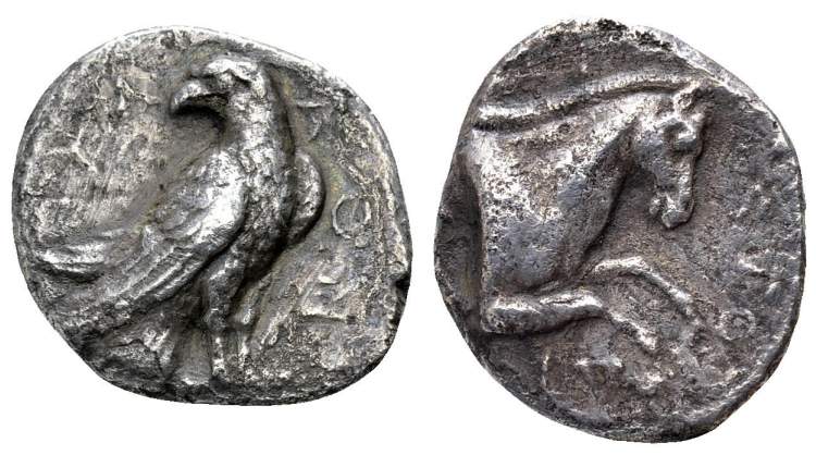 | Savoca 4, 287 | Kyme, Aeolis, AR Didrachm, Ca 350-300 BC. 18mm, 5.77 g. Magistrate ..okrat.. KYMAION, eagle standing right, head turned back / ..MOKΡAT.., Forepart of horse running right. Savoca 4, 287. BMC 14 var (magistrate); Traité II 2059 var (ditto). | Text |  |