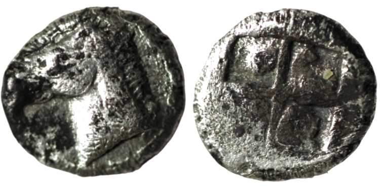 | Tzamalis 92 | Kyme, Aeolis. 480-400 BC. AR Tetartemorion. 6 mm, 0.22 g. Head and neck of horse left. / Quadripartite incuse square with leaf-like marks in the sections. Tzamalis 92 ("Thraco-Macedonian") | Text |  |
