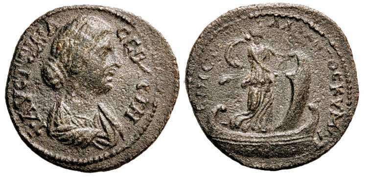 | Paris 215 | Faustina II, AE25 of Kyme, Aeolis. AD 146-180. 7 g. ΦAYCTEINA CEBACTH, draped bust right. / EΠI CTΡ AL..NTOC KYMAI.., Isis Pharia standing right on galley, holding the sail in both hands. Paris 215; SNRIS Supp. Cyme 6.3; Peus 398, 672; RPC IV.2 temp 2604. | Text |  |